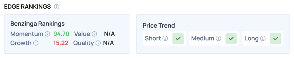 Benzinga Edge Rankings: The stock shows a strong Momentum score of 94.70 but a low Growth score of 15.22, according to data from Benzinga Edge.