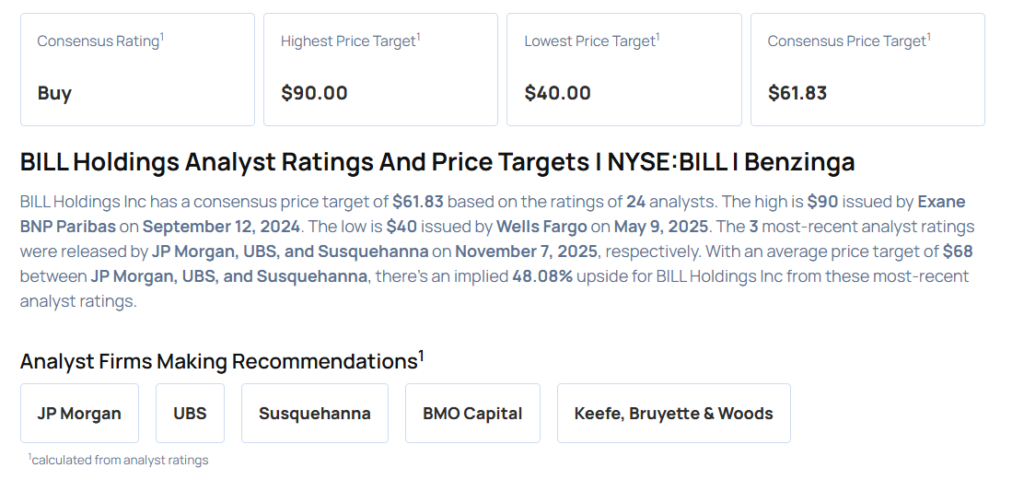 • JP Morgan analyst Tien-Tsin Huang maintained BILL Holdings with an Overweight rating and raised the price target from $55 to $60.