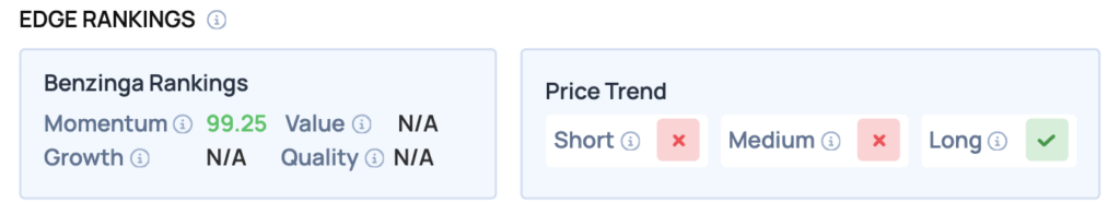 Benzinga Edge Rankings: Despite the morning’s pullback, Benzinga Edge rankings highlight the stock’s very strong Momentum score of 99.25 and a positive long-term price trend.