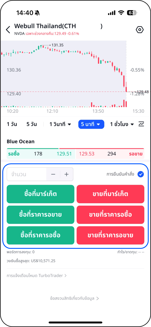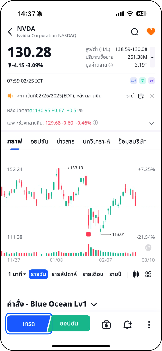ขั้นตอนที่ 1 เลือกหุ้นที่ต้องการเทรดและไปที่หน้าคำสั่งโดยแตะที่ปุ่ม "เทรด" ด้านล่างซ้ายของหน้าจอ