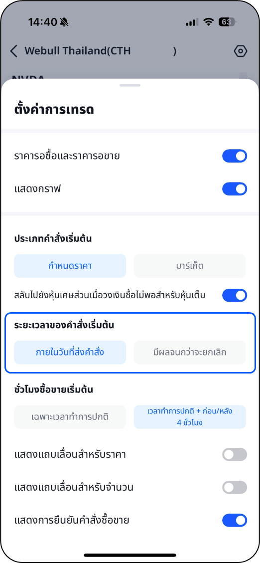 คำสั่งซื้อขายที่มีผลภายในวันที่ส่งคำสั่งจะถูกตั้งเป็นค่าเริ่มต้น คุณสามารถตั้งค่าให้คำสั่งมีผลจนกว่าจะยกเลิกเป็นค่าเริ่มต้นได้หากต้องการ