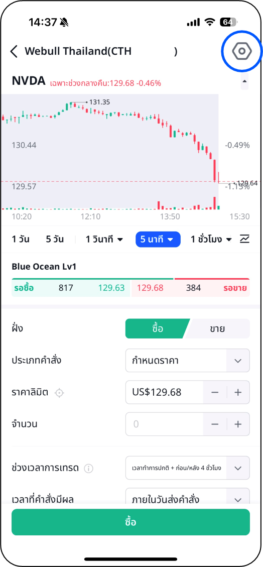 ขั้นตอนที่ 2 แตะที่สัญลักษณ์การตั้งค่าการเทรดที่มุมขวาบนของหน้าจอ