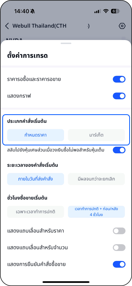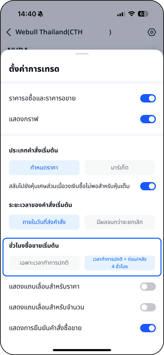 การส่งคำสั่งซื้อขายในเฉพาะช่วงเวลาทำการซื้อขายปกติ จะถูกตั้งเป็นค่าเริ่มต้น หากคุณเป็นนักลงทุนที่ซื้อขายนอกเวลาทำการซื้อขายปกติของตลาดหุ้นอเมริกา คุณสามารถตั้งค่าชั่วโมงซื้อขายให้ครอบคลุม 4 ชั่วโมงก่อนและหลังเวลาทำการปกติได้เช่นกัน