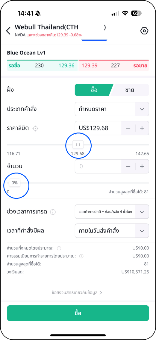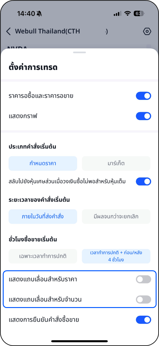 คุณสามารถเลื่อนแถบไปมาเพื่อเปลี่ยนราคาและจำนวนหุ้นแทนการระบุเป็นตัวเลข