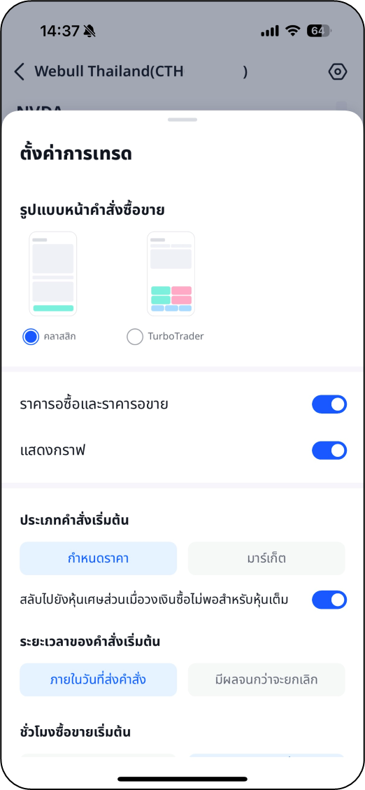 นี่เป็นครั้งแรกที่คุณเทรดหุ้น หรือยังไม่เคยเปลี่ยนการตั้งค่าการเทรดมาก่อน หน้าจอคำสั่งของคุณจะแสดงข้อมูลตามการตั้งค่าเริ่มต้น เช่น การกำหนดประเภทคำสั่ง รูปแบบหน้าคำสั่ง และระยะเวลาที่คำสั่งมีผล ซึ่งอาจแตกต่างจากสไตล์การเทรดของคุณ หากคุณต้องการตั้งค่าหน้าการซื้อขายให้เป็นไปตามสไตล์ของคุณ ทำตามคำแนะนำทีละขั้นตอนต่อไปนี้ เพื่อปรับแต่งหน้าจอของคุณได้เลย!