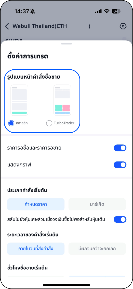 เลือกรูปแบบหน้าคำสั่งซื้อขายที่คุณต้องการ มีรูปแบบหน้าคำสั่ง 2 แบบ ได้แก่ แบบคลาสสิก และการซื้อขายแบบใช้ปุ่มลัด (TurboTrader)