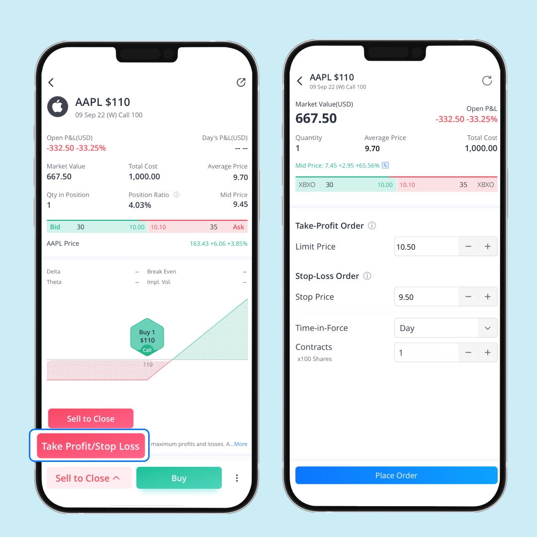 แต่เมื่อเร็วๆ นี้ ราคาของ AAPL กลับปรับตัวลดลง ทำให้สัญญาคอลออปชันของคุณนั้นมีมูลค่าลดลง ในกรณีนี้ คุณอาจตัดสินใจส่งคำสั่งเพื่อล็อกกำไรที่เป็นไปได้และหยุดการขาดทุนที่อาจเกิดขึ้น