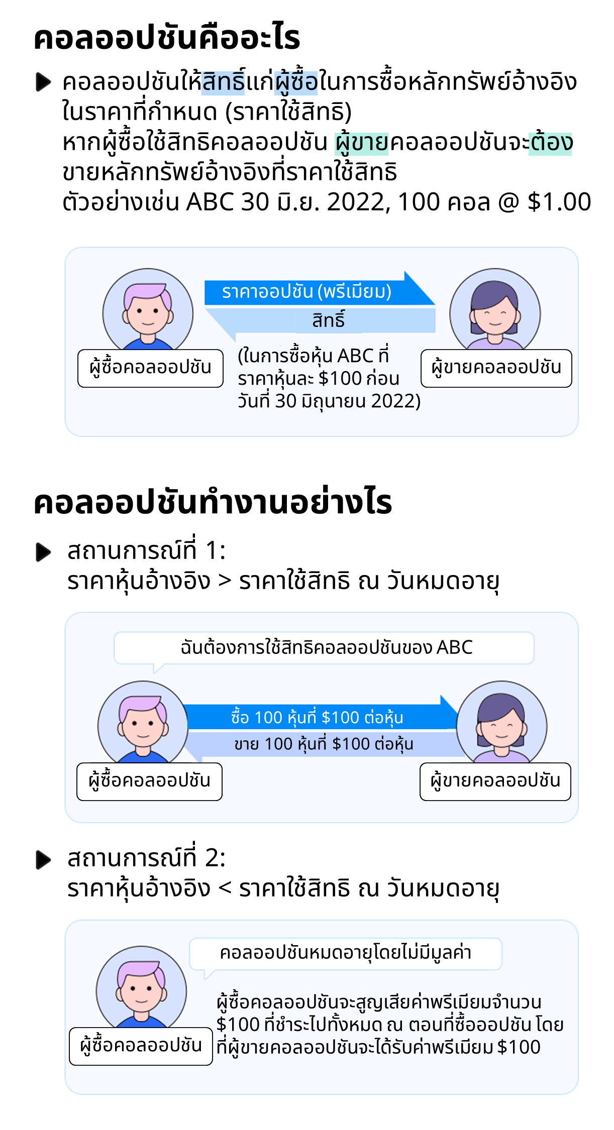 เนื้อหาต่อไปนี้จะแสดงให้เห็นว่าคอลออปชันทำงานอย่างไร และจะเกิดอะไรขึ้นกับผู้ซื้อคอลออปชัน