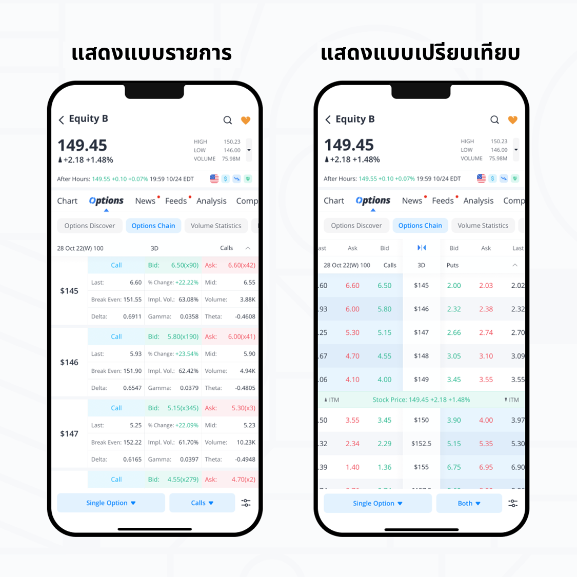 • กลยุทธ์การเทรดต่างๆ ประเภท Call และ Put รวมถึงราคาเสนอซื้อ/ขาย