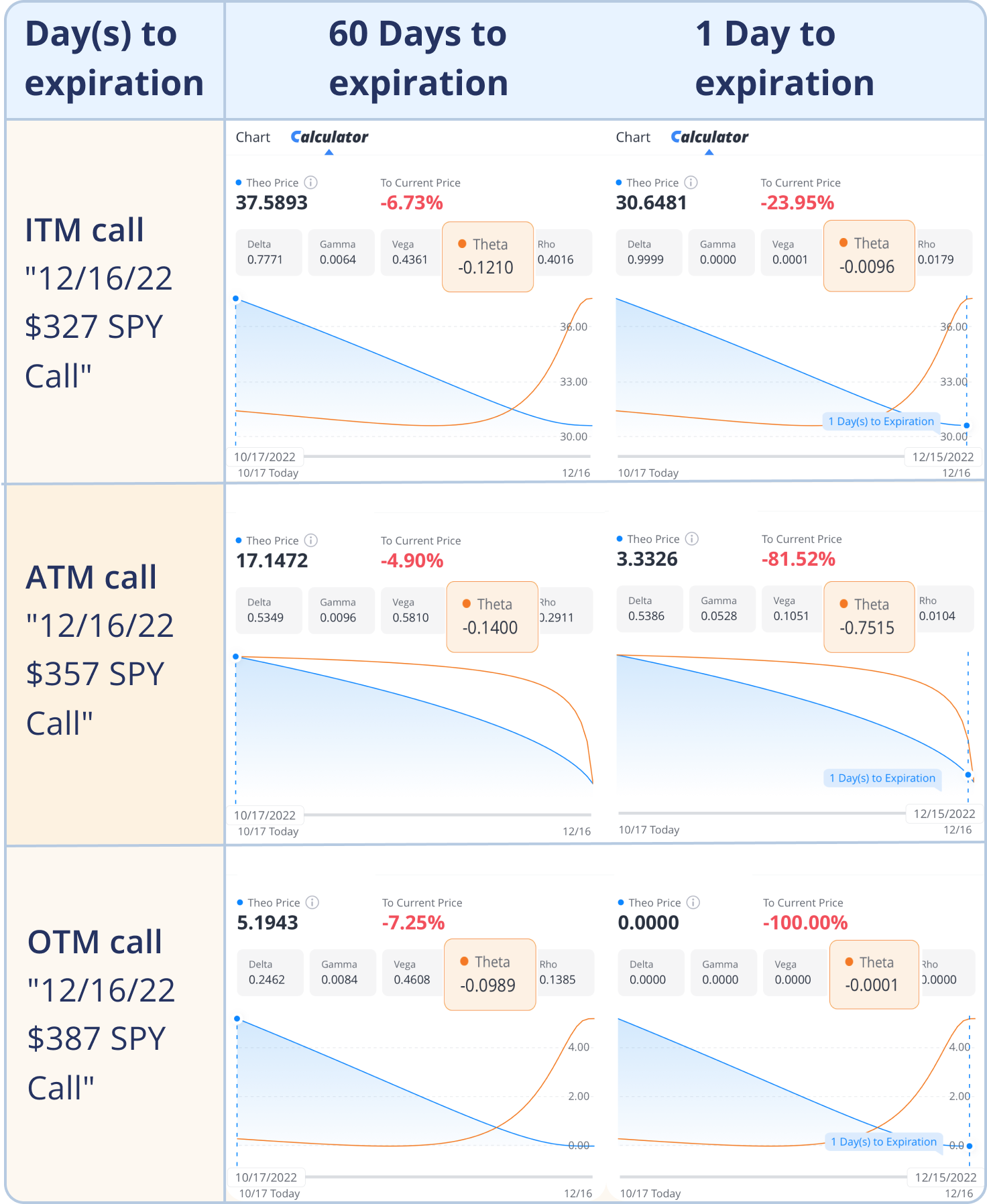 จากการพิจารณาภาพด้านบนอย่างละเอียดแล้ว จะช่วยให้สามารถมองเห็นภาพได้ชัดเจนขึ้นว่า Theta ทำงานอย่างไรในระดับราคาใช้สิทธิ์ต่างๆ เมื่อเข้าใกล้วันหมดอายุ ภายใต้เงื่อนไขที่ปัจจัยอื่นๆ ยังคงเดิม