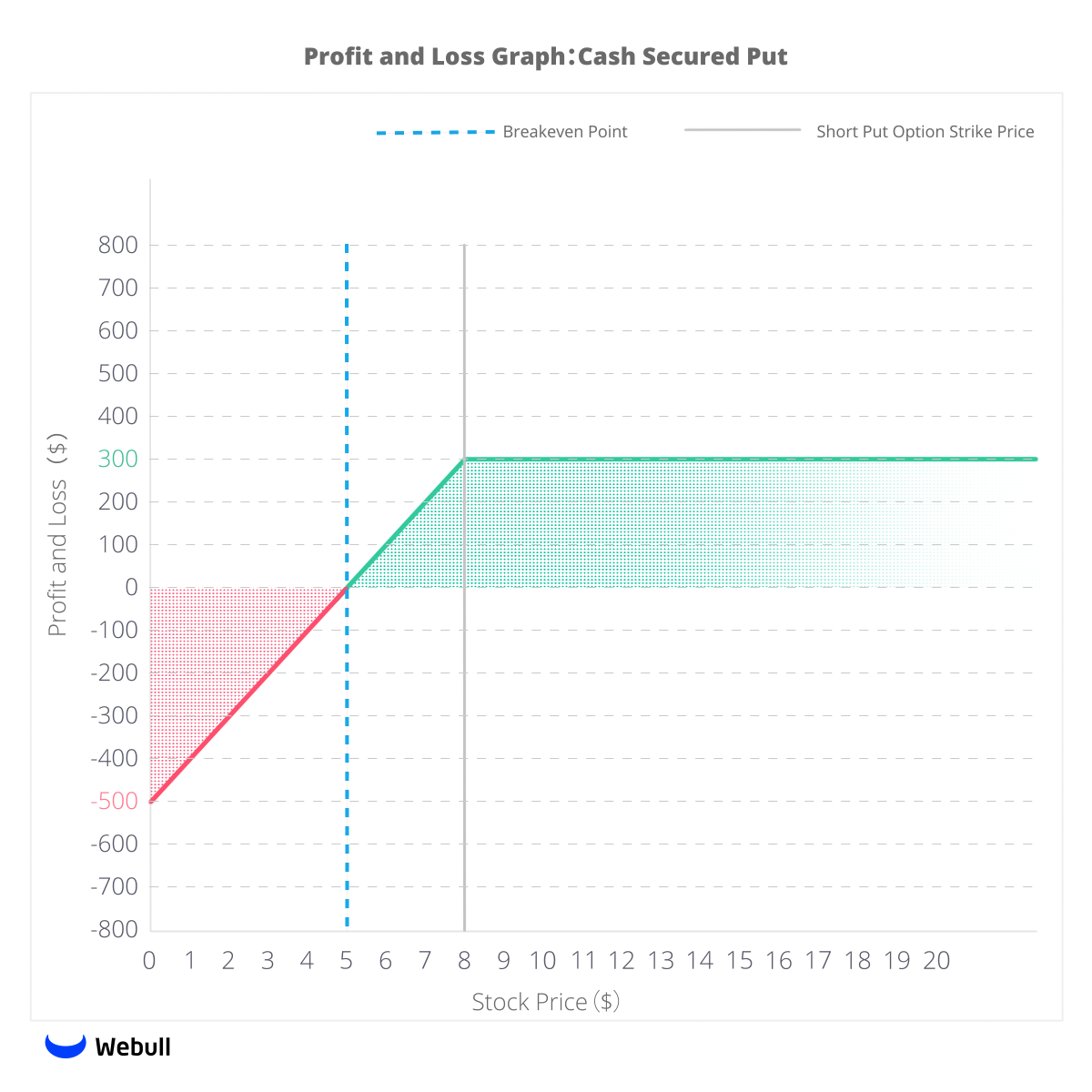 สำหรับ จุดคุ้มทุน (Breakeven Point) จะได้จากการนำราคาใช้สิทธิ (Strike Price) ของพุทออปชันมาลบด้วยค่าพรีเมียมที่ได้รับ ในตัวอย่างนี้คือ 8 – 3 = 5 ดอลลาร์ กรณีที่ราคาหุ้นอยู่ระหว่าง 5 ถึง 8 ดอลลาร์ นักลงทุนอาจถูกใช้สิทธิซื้อหุ้น แต่ยังมีโอกาสทำกำไรสุทธิระหว่าง $0 ถึง $300 เนื่องจากค่าพรีเมียมยังช่วยลดต้นทุนการลงทุน