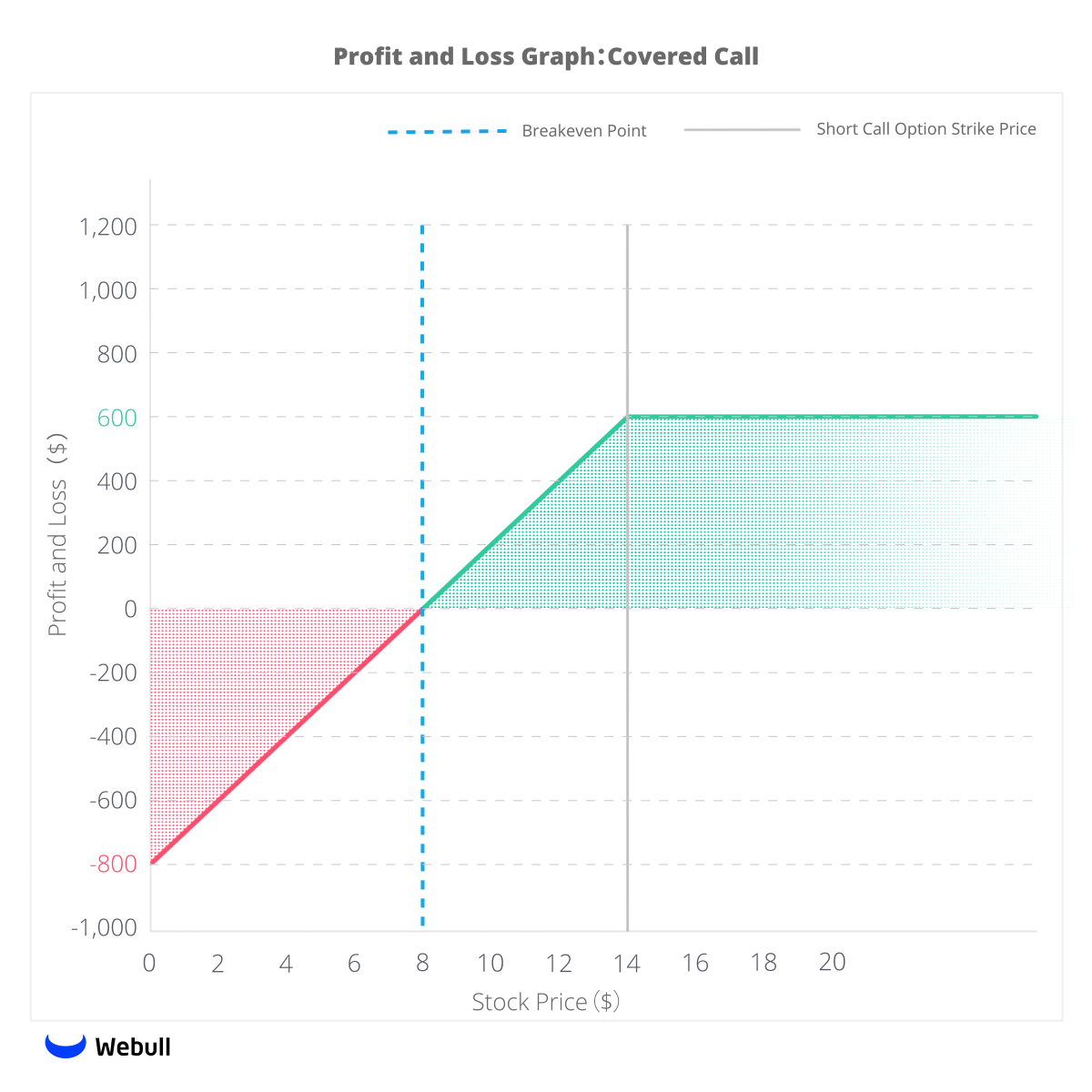 หากราคาหุ้น RAWR ขึ้นไปที่ 14 ดอลลาร์หรือต่ำ ๆ กว่านั้น นักลงทุนจะได้กำไรสูงสุด 600 ดอลลาร์ โดยประกอบด้วย 400 ดอลลาร์จากการเพิ่มขึ้นของราคาหุ้น และ 200 ดอลลาร์จากค่าพรีเมียมที่ได้จากการขายคอลออปชัน ในทางกลับกัน ความเสี่ยงขาดทุนสูงสุดคือ 800 ดอลลาร์ ซึ่งมาจากการขาดทุน 1,000 ดอลลาร์ หากราคาหุ้นลดลงเหลือ 0 ดอลลาร์ แต่ถูกชดเชยบางส่วนด้วยค่าพรีเมียม 200 ดอลลาร์