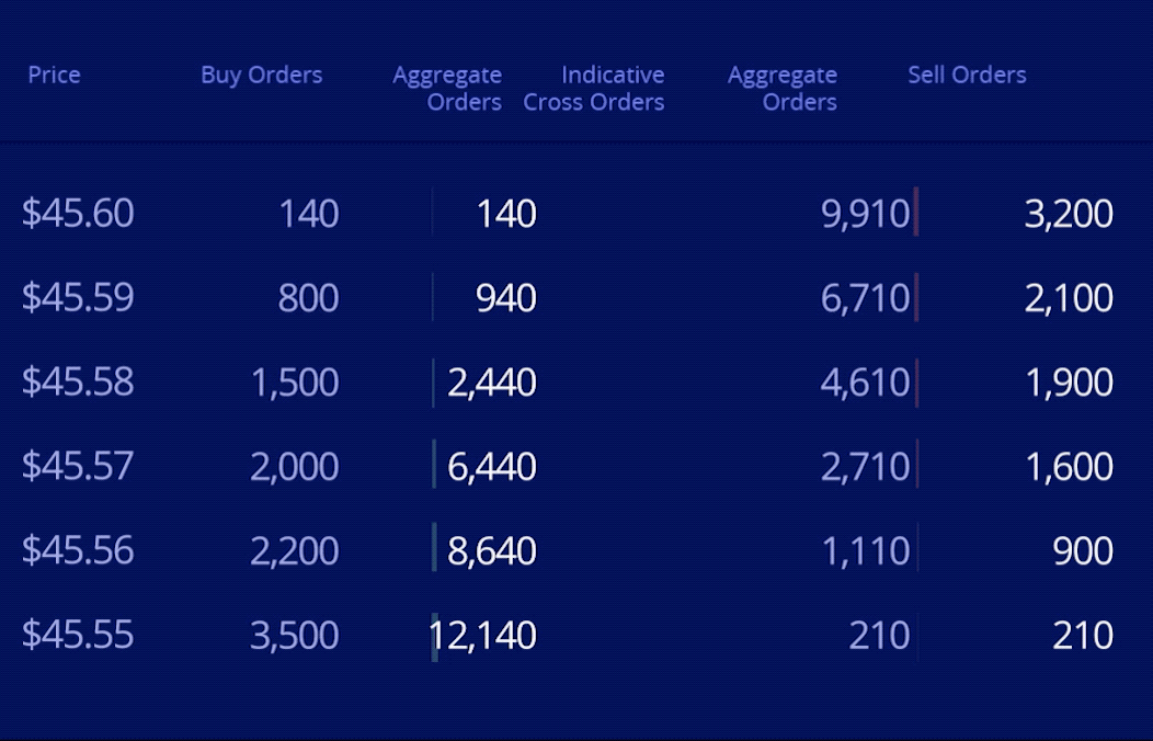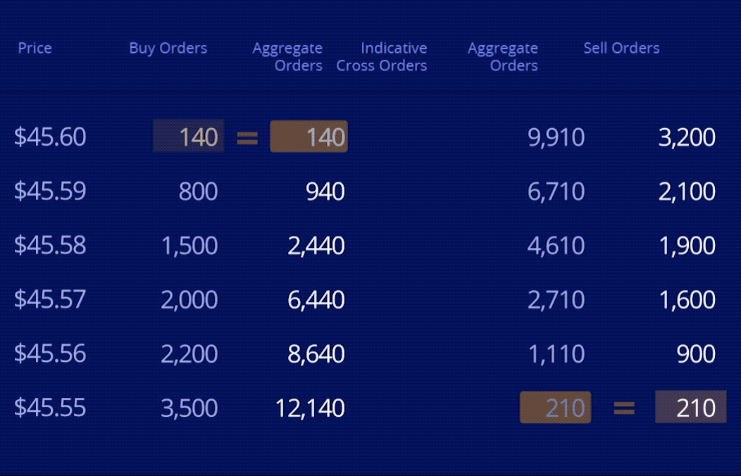 คำสั่งซื้อขายที่ตัดกันที่เป็นดัชนีคือปริมาณคำสั่งซื้อขายที่เข้าข่ายสำหรับจับคู่ในแต่ละระดับราคา โดยจะเลือกจากค่าที่ต่ำกว่าของคู่คำสั่งซื้อโดยรวมและคำสั่งขายโดยรวมในแต่ละระดับราคา