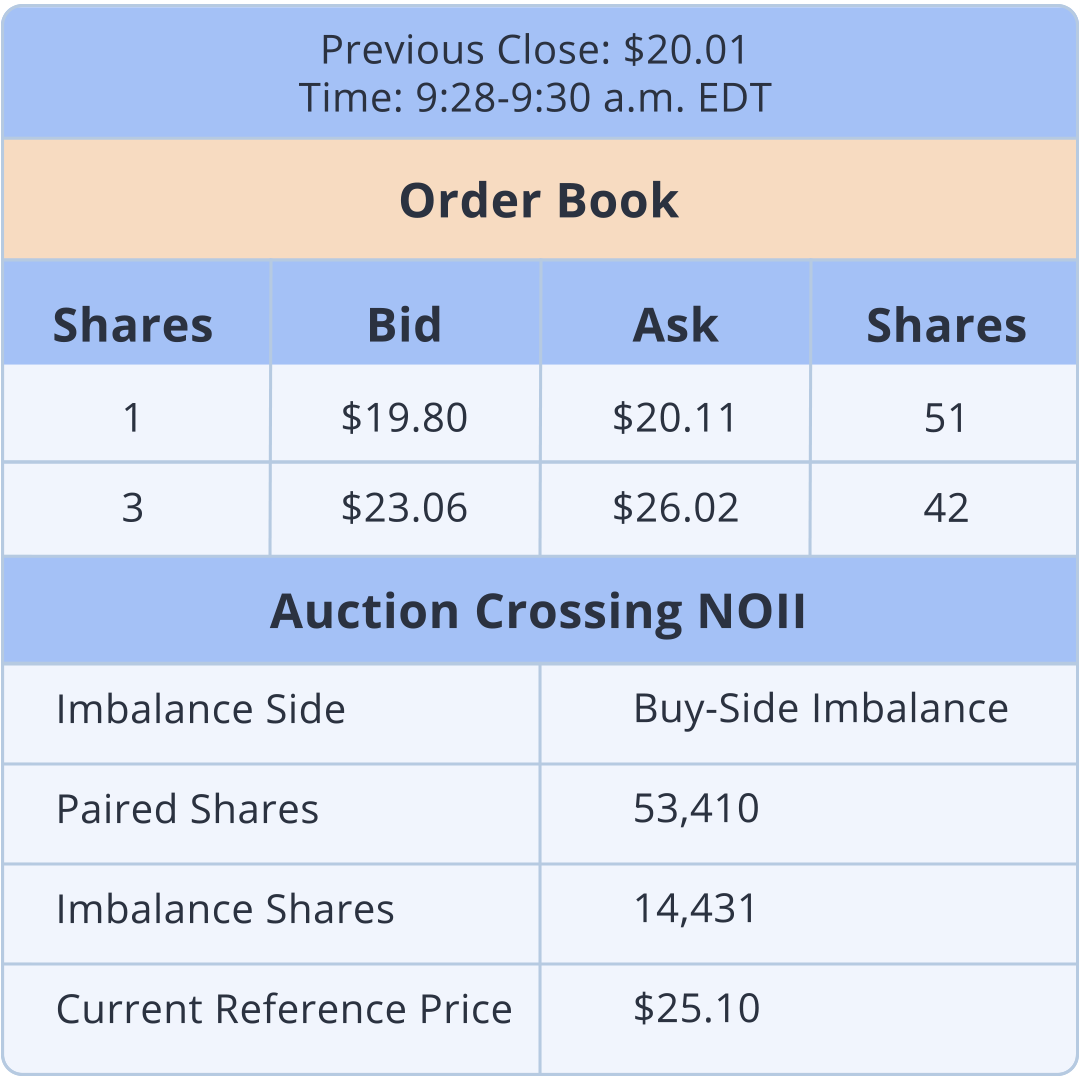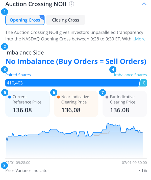ข้อมูล Auction Crossing NOII ให้ความโปร่งอย่างไม่มีใครเทียบได้แก่นักลงทุนเกี่ยวกับการเปิดตลาด การปิดตลาด IPO และ การหยุดการซื้อขายของ Nasdaq ข้อมูล NOII จะแจ้งทุกๆ ห้าวินาทีระหว่างเวลา 9:28 น. ถึง 9:30 น. EST สำหรับการเปิดตลาด และจะแจ้งระหว่างเวลา 15:50 น. ถึง 16:00 น. EST สำหรับการปิดตลาด
