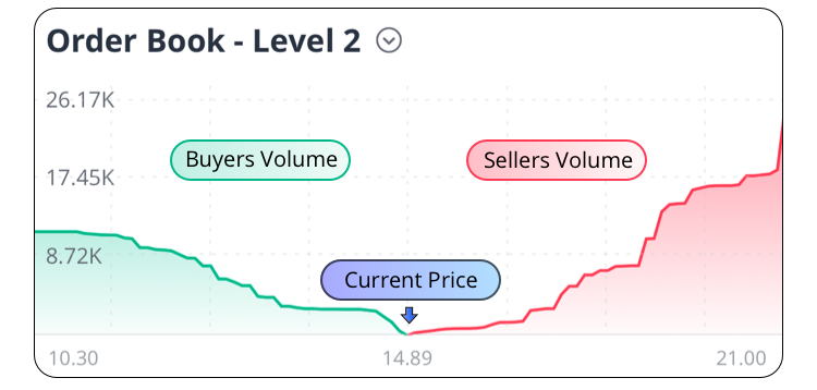 นอกเหนือจากราคาเสนอซื้อและเสนอขาย 50 รายการ จะมีกราฟแสดงราคาเสนอซื้อและเสนอขาย ซึ่งในกราฟนี้ แกนนอนจะแสดงถึงราคา และแกนตั้งจะแสดงถึงปริมาณ พื้นที่สีเขียวทางด้านซ้ายคือปริมาณของผู้ซื้อ ในขณะที่พื้นที่สีแดงทางด้านขวาคือปริมาณของผู้ขาย และราคาตลาดปัจจุบันจะอยู่ตรงด้านล่างที่เส้นสีเขียวและสีแดงบรรจบกัน
