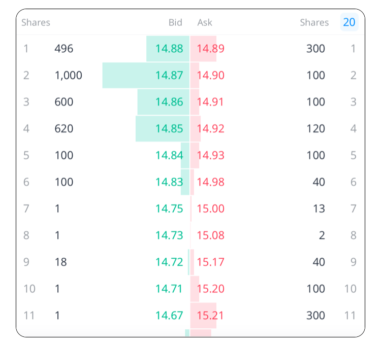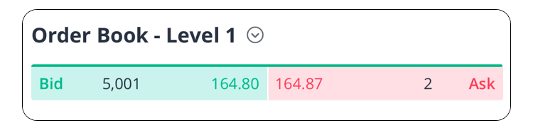 ในระดับ 1 จะแสดงเฉพาะราคาเสนอซื้อและเสนอขายที่ดีที่สุดอย่างละ 1 ช่องราคาเท่านั้น ในตัวอย่างด้านล่าง ราคาสูงสุดที่ตลาดยินดีจ่ายสำหรับหุ้น A คือ $164.80 (ราคาเสนอซื้อ) และจำนวนหุ้นทั้งหมดที่เสนอซื้อในราคานี้คือ 5,001 (ขนาดเสนอซื้อ) หากนักลงทุนวางคำสั่งขายหุ้น A เป็นแบบมาร์เก็ต คำสั่งจะถูกจับคู่ที่ราคา $164.80 เพราะว่ามีคำสั่งรอซื้อจำนวนมากที่พร้อมจะจับคู่ในราคา $164.80