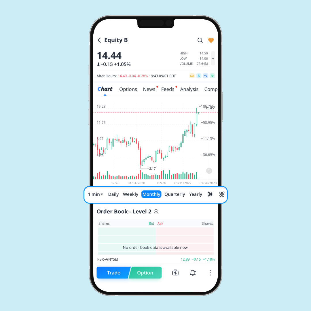 คุณสามารถมองเห็นภาพรวมของการเคลื่อนไหวของราคาในอดีตได้ชัดเจนยิ่งขึ้น โดยการเปลี่ยนกรอบเวลาจากนาทีเป็นปี