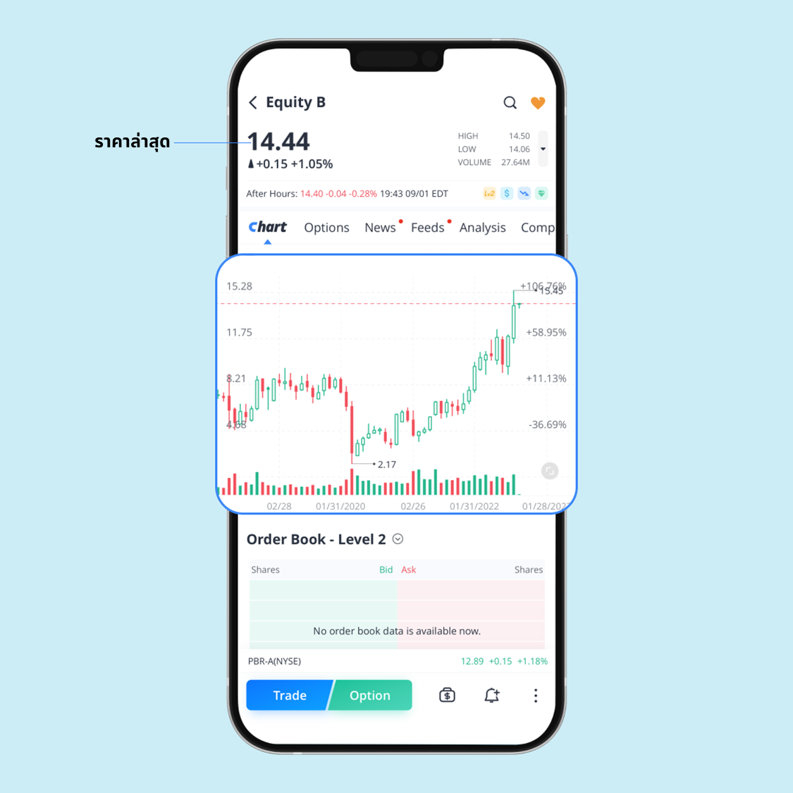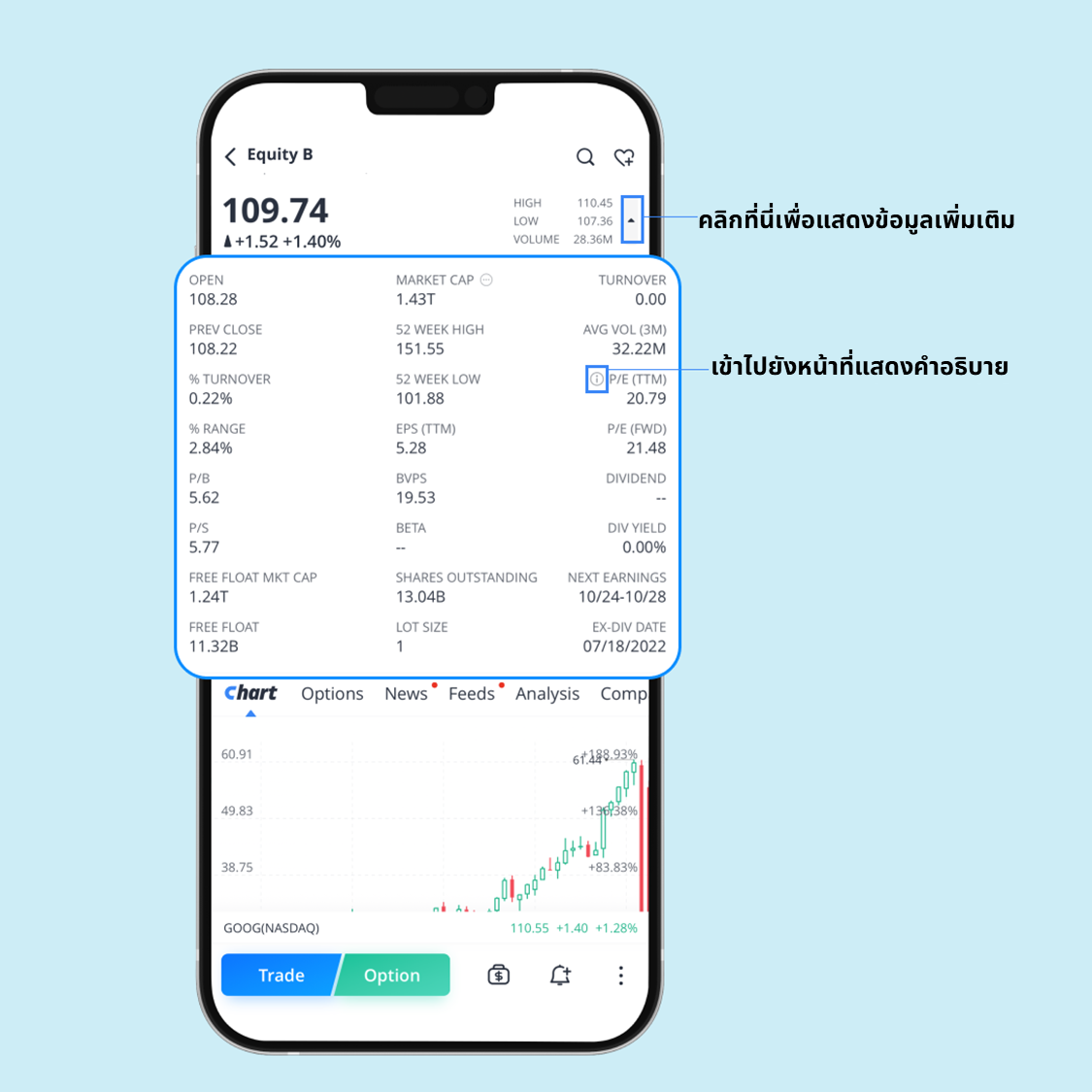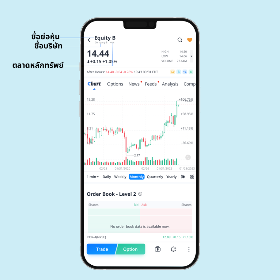 บนหน้ารายละเอียดของหุ้น คุณสามารถตัดสินใจได้ว่าจะซื้อหรือจะขาย โดยหน้านี้จะรวบรวมข้อมูลสำคัญที่คุณจะต้องใช้ในการตัดสินใจลงทุน หากคุณเป็นมือใหม่ แนะนำให้ศึกษาข้อมูลในบทเรียนนี้ก่อนทำการซื้อขายครั้งแรก