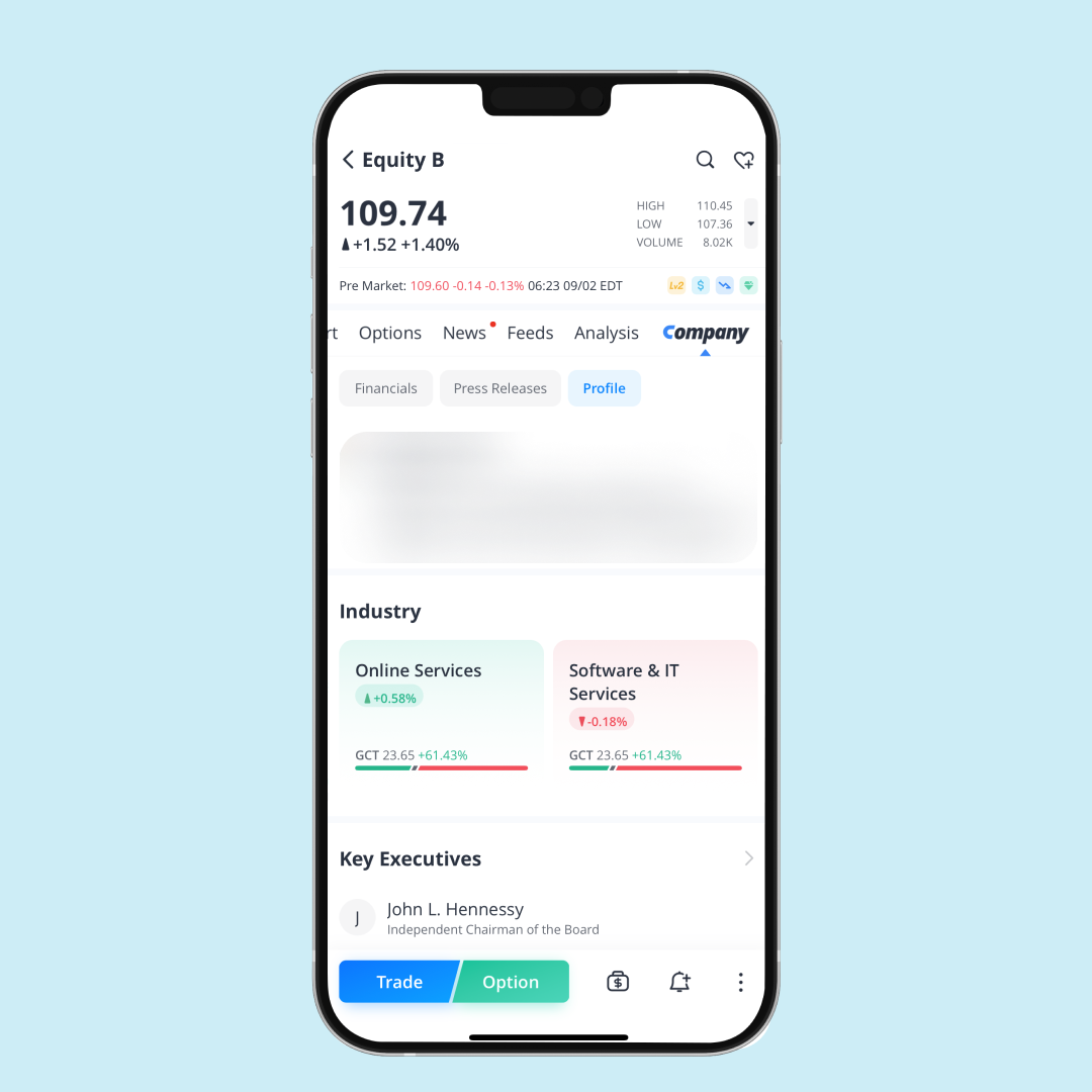 ข้อมูลบริษัท (Company Profile): ตรงนี้คุณจะพบกับข้อมูลเบื้องต้นเกี่ยวกับบริษัท เช่น ประเภทธุรกิจหลัก ประวัติ ที่ตั้งสำนักงานใหญ่ ผู้ก่อตั้ง ฯลฯ และจะระบุด้วยว่าบริษัทอยู่ในภาคส่วน/อุตสาหกรรมใด