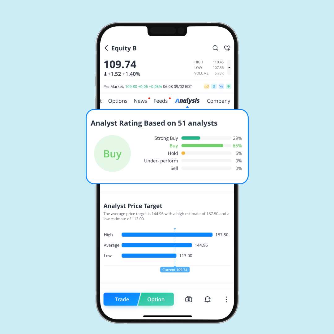 นอกเหนือจากไอเดียของนักลงทุนคนอื่นๆ คุณยังสามารถตรวจสอบข้อมูลมุมมองนักวิเคราะห์ได้อีกด้วย เช่นเดียวกับภาพด้านล่างที่มีผลการวิเคราะห์ออกมาว่า "ซื้อ" ซึ่งหมายความว่านักวิเคราะห์ทั้ง 51 คนมีความคิดเห็นตรงกันว่าหุ้นนี้น่าลงทุน อย่างไรก็ตาม ข้อมูลการวิเคราะห์นี้มีไว้เพื่อเป็นการอ้างอิงเท่านั้น และไม่ควรถือเป็นคำแนะนำในการลงทุนแต่อย่างใด
