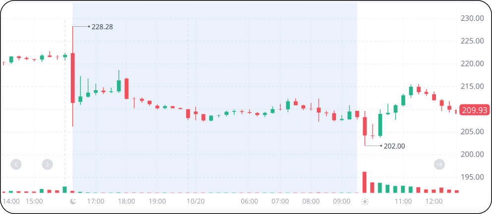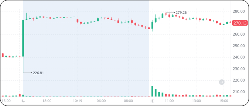 กราฟ 15 นาทีด้านล่าง จะแสดงให้เห็นว่าตลาดอาจมีการตอบสนองอย่างไรต่อการประกาศรายได้ที่น่าผิดหวัง หลังตลาดปิดในวันที่ 19 ตุลาคม บริษัทได้ประกาศรายได้รวมที่ 21.45 พันล้านดอลลาร์ ต่ำกว่าที่นักวิเคราะห์คาดการณ์ไว้ที่ 21.96 พันล้านดอลลาร์ การประกาศรายได้ที่น่าผิดหวังส่งผลให้ราคาหุ้นของบริษัททรุดตัวลงมากกว่า 5% ทันทีหลังจากประกาศผลประกอบการ