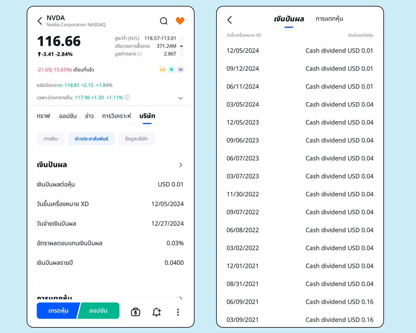 เงินปันผล: คุณสามารถดูข้อมูลเงินปันผลต่อหุ้น อัตราผลตอบแทนจากเงินปันผล และเงินปันผลต่อปีได้ตามวิธีด้านล่างนี้