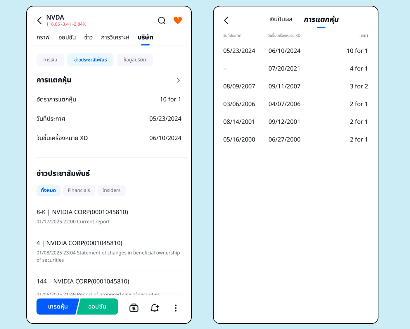 การแตกหุ้น: คุณสามารถดูอัตราส่วนการแตกหุ้นได้ในส่วนนี้
