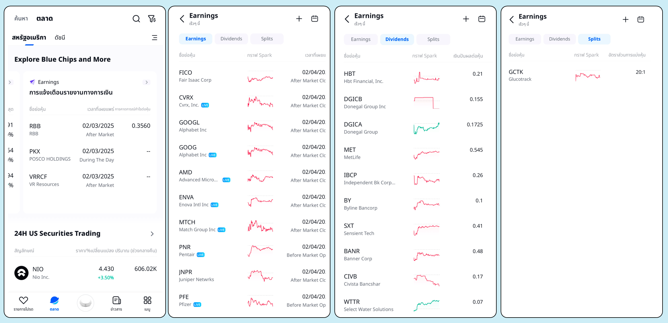 วิธีการเข้าใช้งาน: ตลาด > สหรัฐอเมริกา > Explore Blue Chips and More > การแจ้งเตือนรายงานทางการเงิน > Earnings/Dividends/Splits
